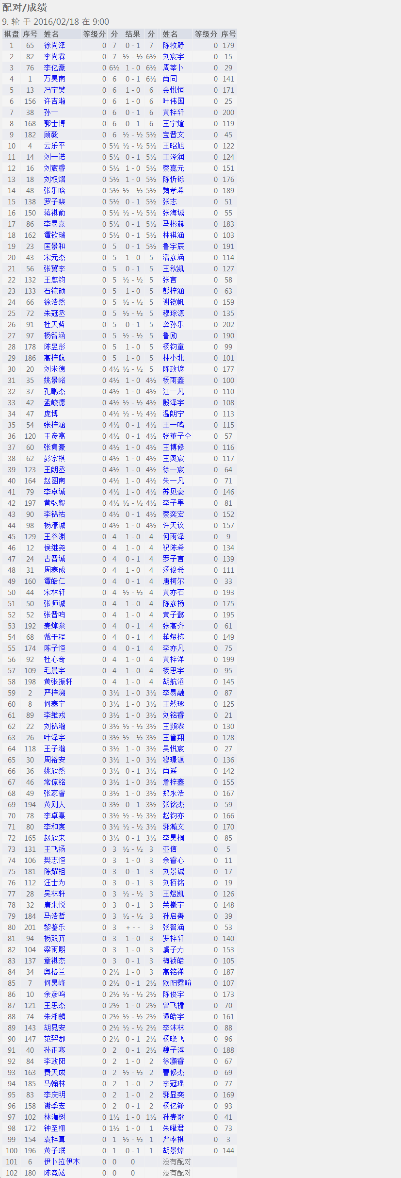 2016年李成智杯男子8岁组第9轮配对及名次表--珠海赛区