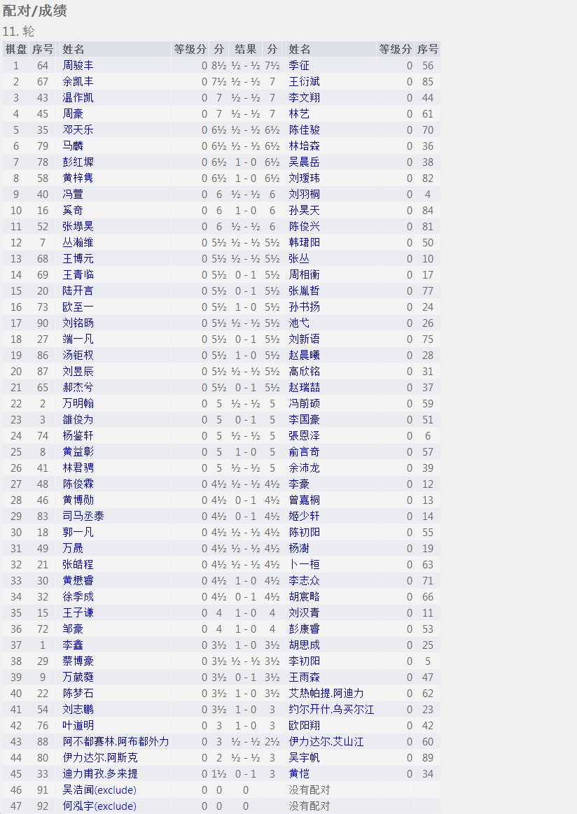 2016年李成智杯男子乙组第11轮配对及名次表--开化赛区