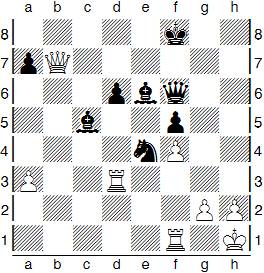 闪出的“中间子”(马)和它后面的露攻棋子(象),同时将军(双将),逼迫白方王只有避将一法。黑方这步双将吃车,是为了马到f7制造杀局,先行消除这个格子的保护子。